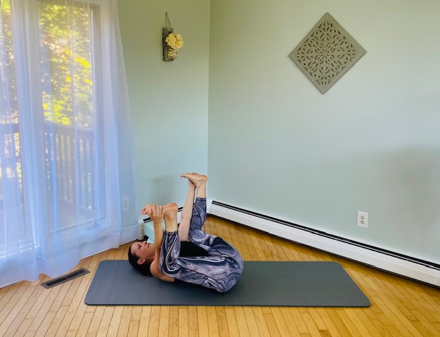 - Gently pull your knees toward your armpits while keeping your lower back on the ground